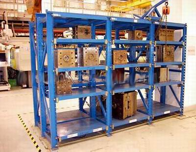 • 模具貨架,主要存放各種模具物品,根據層載能力要求分為輕型模具貨架和重型模具貨架。貨架頂部可配置移動葫蘆車,以方便模具的起吊。輕型模具貨架采用100×50mmC型鋼作為專用立柱,立柱由優質Q235帶鋼經軋機一次性軋制而成。抽屜盤框架一般采用矩形管和4.0折彎件焊接而成上鋪鋼板。導向槽采用4.0鋼板折彎而成。頂部、底部采用橫梁連接,頂部鋪頂板,頂板可存放物品。
